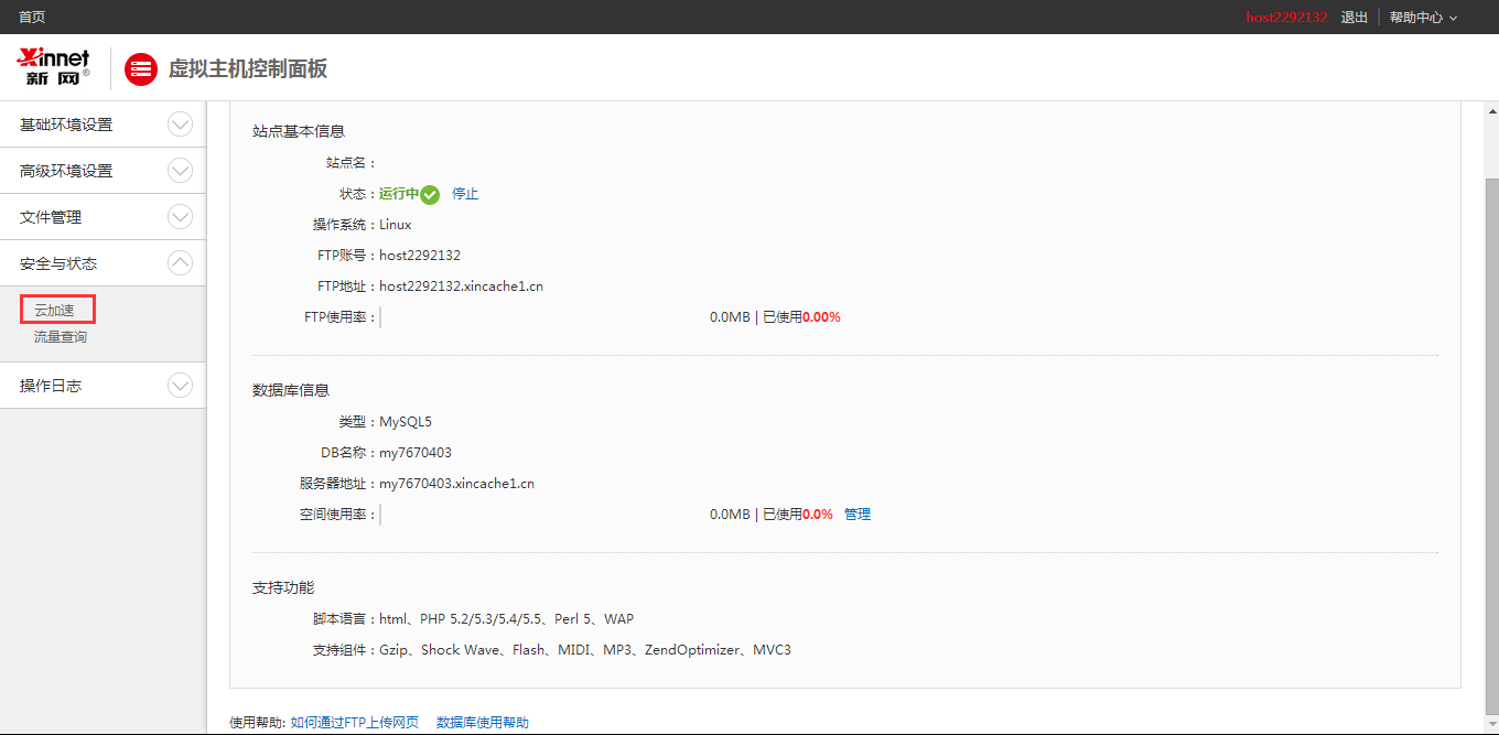 1. 登錄cp.xinnet.com,選擇“安全與狀態(tài)”,選擇“云加速”;