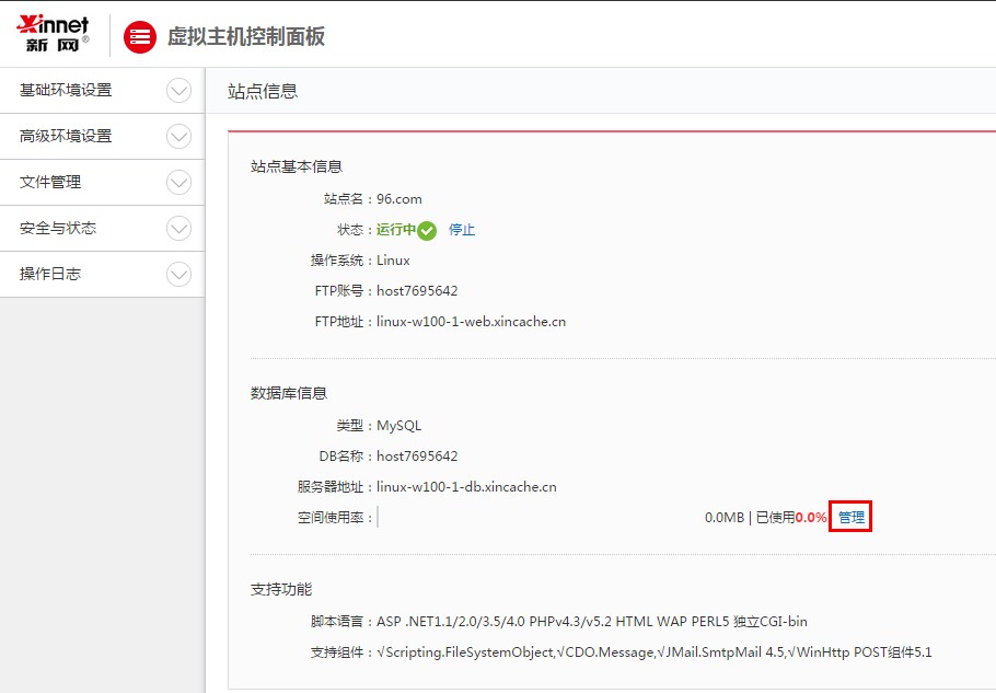 1、 當(dāng)您進(jìn)入虛擬主機(jī)控制面板,點(diǎn)擊“管理”,可以登錄至phpMyAdmin的首頁(yè),在此頁(yè)面中您可以對(duì)您的數(shù)據(jù)庫(kù)進(jìn)行管理。