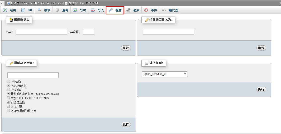 4、 數(shù)據(jù)庫(kù)“操作”功能,提供添加表、重命名表、復(fù)制的功能。如下圖: